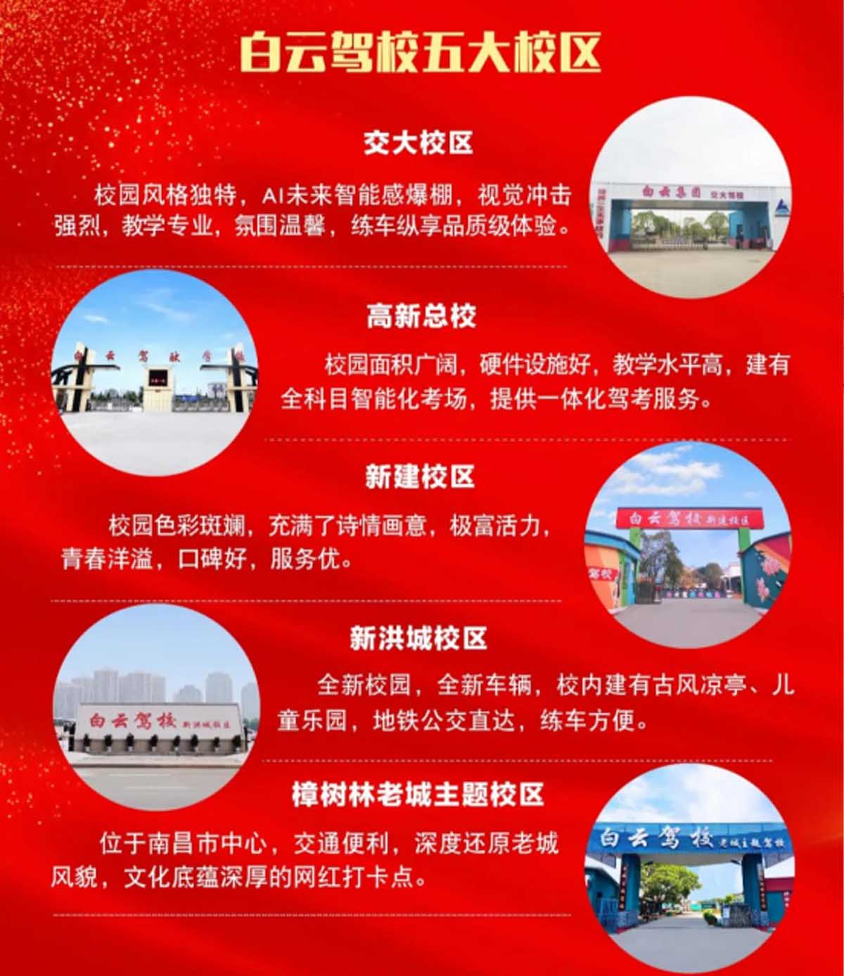 白云驾校共有五大校区,高新总校,校园面积广阔,硬件设施好;交大校区,校园风格独特,AI未来智能感爆棚;樟树林老城主题校区,交通便利,深度还原老城风貌;新建校区,校园色彩斑斓,充满了诗情画意;新洪城校区,地铁公交直达,学车十分方便,各校区都极具特色。
